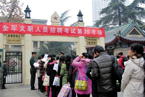 12月15日,在解放軍南京政治學(xué)院考點(diǎn),考生等候進(jìn)場(chǎng)參加考試。當(dāng)日,軍隊(duì)首次統(tǒng)一招聘文職人員考試舉行,據(jù)解放軍總政治部有關(guān)部門(mén)介紹,共有10萬(wàn)余人報(bào)名應(yīng)聘,報(bào)名和錄取比例平均為38∶1。